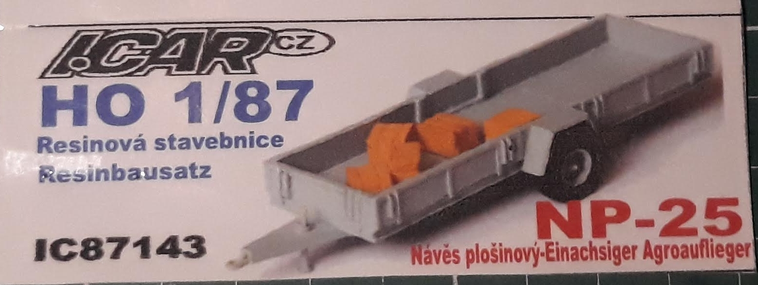 NP-25 -- Návěs Plošinový, užitečný náklad 2500 kg. Jednoduchý resinový model od ICARu. Plaťák neboli plošina bude zapřažen za Zetor 50 Super, náklad (?).